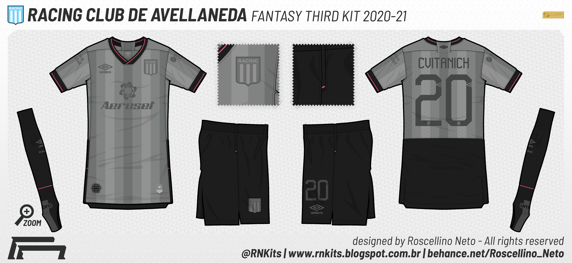 O third foi trabalhado na ideia de se destacar na coleção. Para isso, utilizei faixas em tons de cinza na camisa, com a composição sendo feita por detalhes em preto e rosa, fazendo alusão às primeiras cores do clube. Todos os logos foram aplicados num cinza mais escuro, ficando camuflados nas peças.