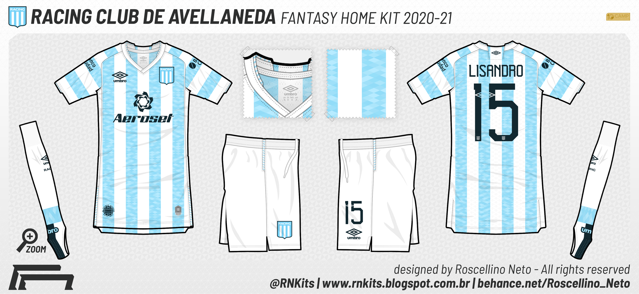 Optei por trabalhar em versões da Umbro para a equipe nessa coleção. A camisa home segue a tradição das faixas albicelestes, com o diferencial das faixas criadas a partir do grafismo dos losangos, tomando como base o logo da marca inglesa. Pequenas faixas azuis foram aplicadas na gola, punhos e lateral da camisa.