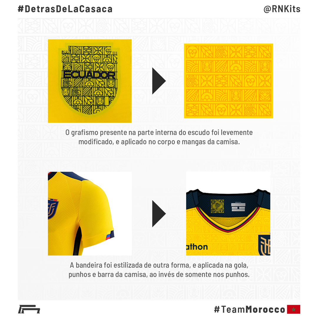 A proposta da primeira rodada é de recriar uma das camisas do mundial. Caí com a camisa home do Equador, onde a proposta foi adaptar o desenho da parte interna do escudo para o corpo e mangas da camisa. Além disso, aplicar a bandeira nacional de forma mais discreta, na gola, punhos e barra.