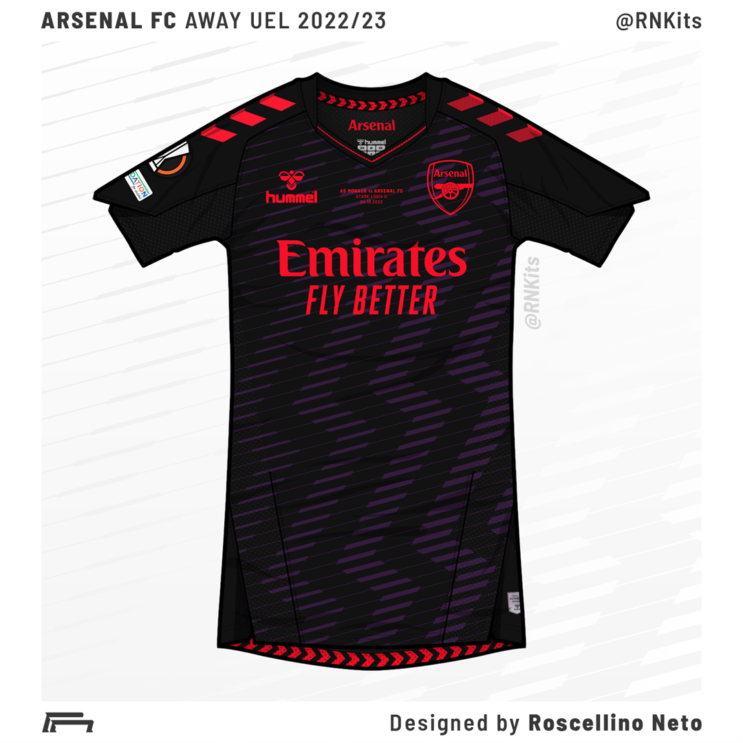 Para a away do Arsenal eu trouxe uma paleta em preto e roxo, com as aplicações num vermelho neon. Os raios foram criados com base no chevron da Hummel.