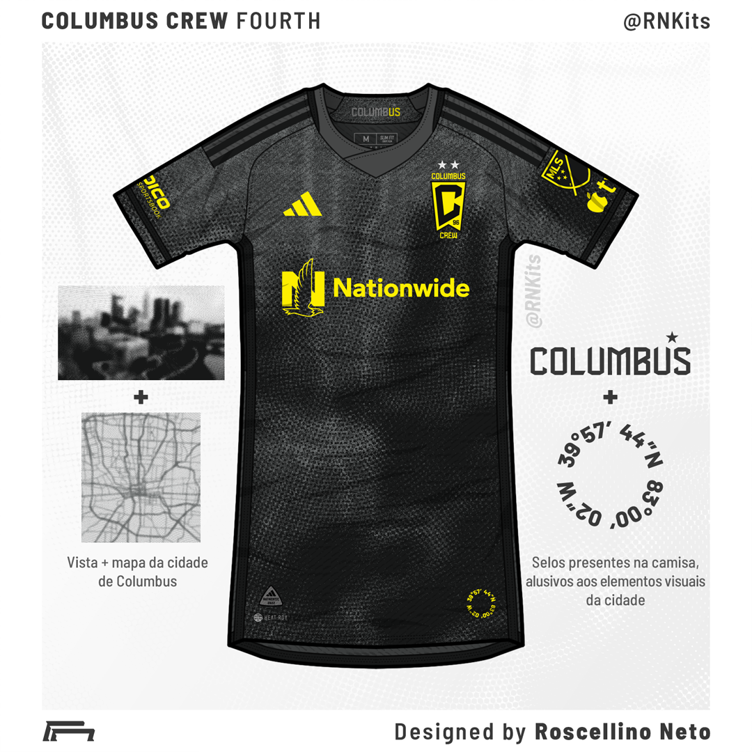 A camisa fourth do Columbus Crew devia ser uma City Edition, com base na cidade de Columbus. Optei por usar tons de cinza e apliquei a visão aérea da cidade + o mapa na composição da camisa. Os selos também fazem referência à cidade, com as coordenadas e referência ao selo da mesma.