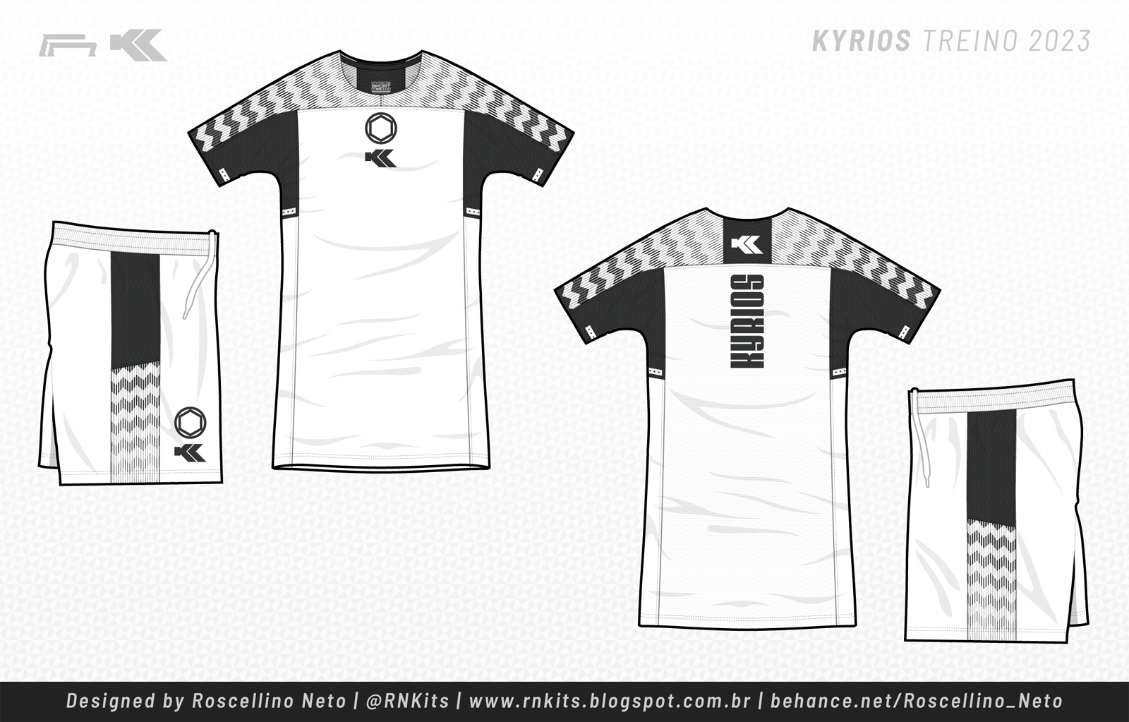 O template traz cortes mais arrojados na parte superior da camisa, unindo à manga. O short complementa a camisa com o corte lateral.