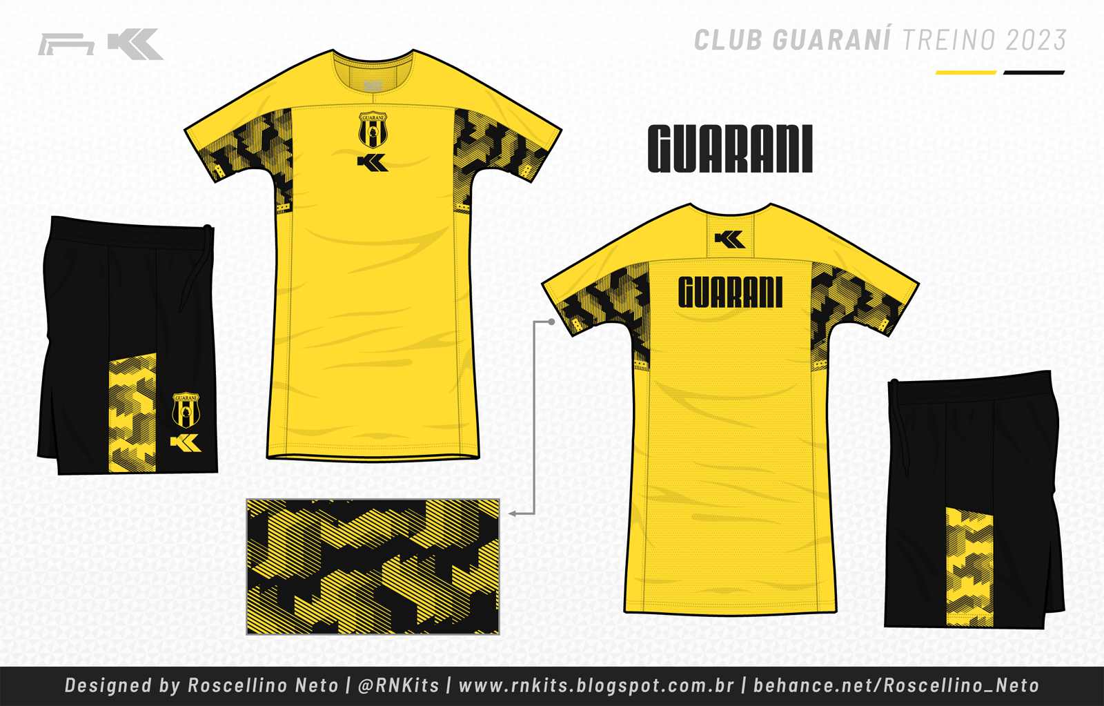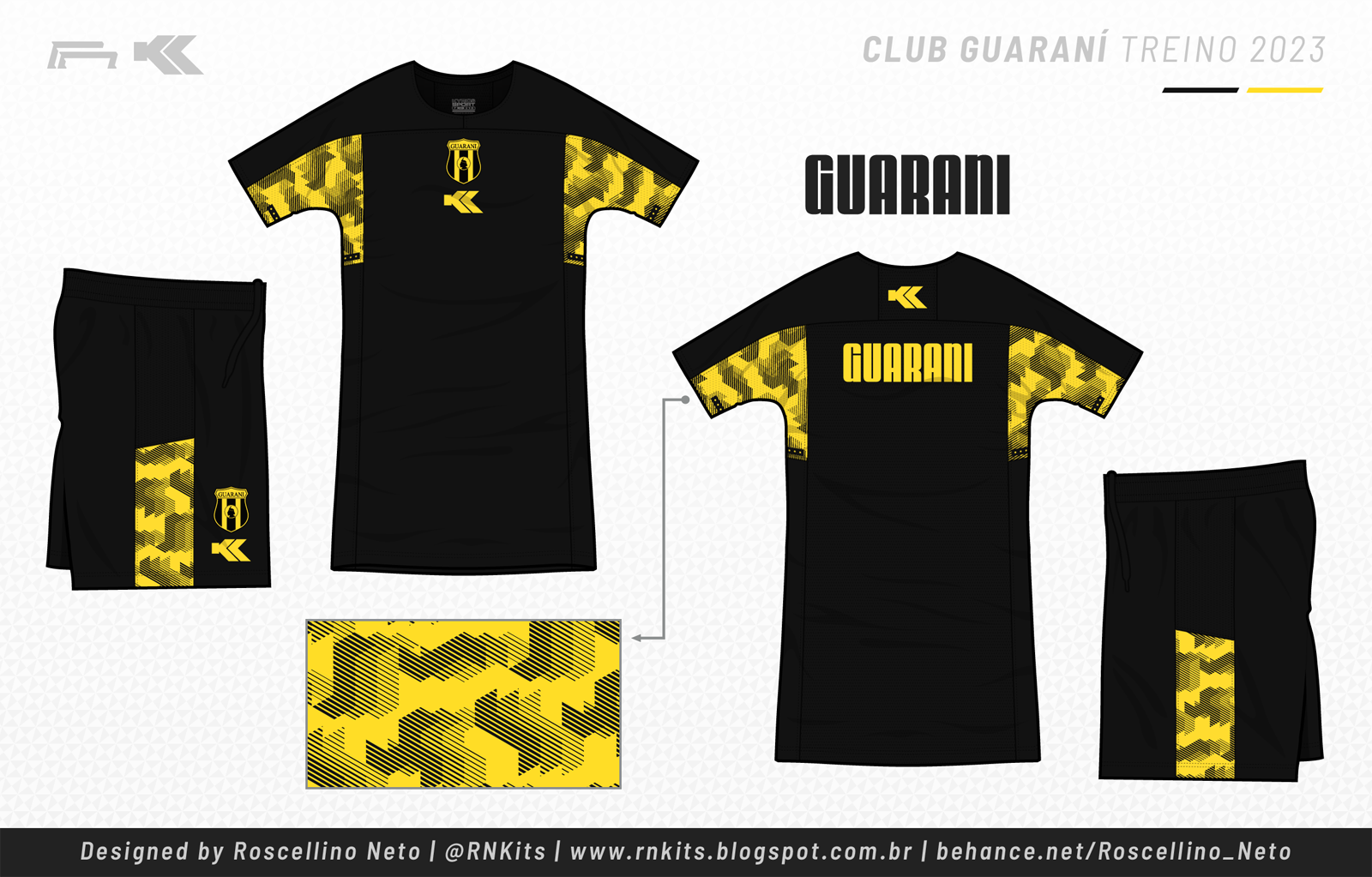 Já para o Guarani, optei por trabalhar somente nas cores do clube, em preto e amarelo. Nesses, apliquei o padrão no corte inferior das mangas, diferenciando bem das demais camisas.