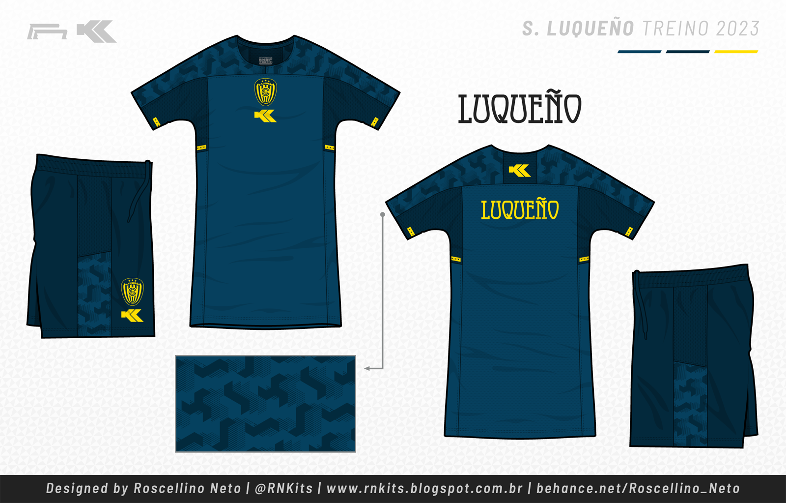 No Luqueño, também trabalhei nas cores da equipe. A proposta da primeira camisa é toda azul, com o tom mais escuro presente nas mangas.