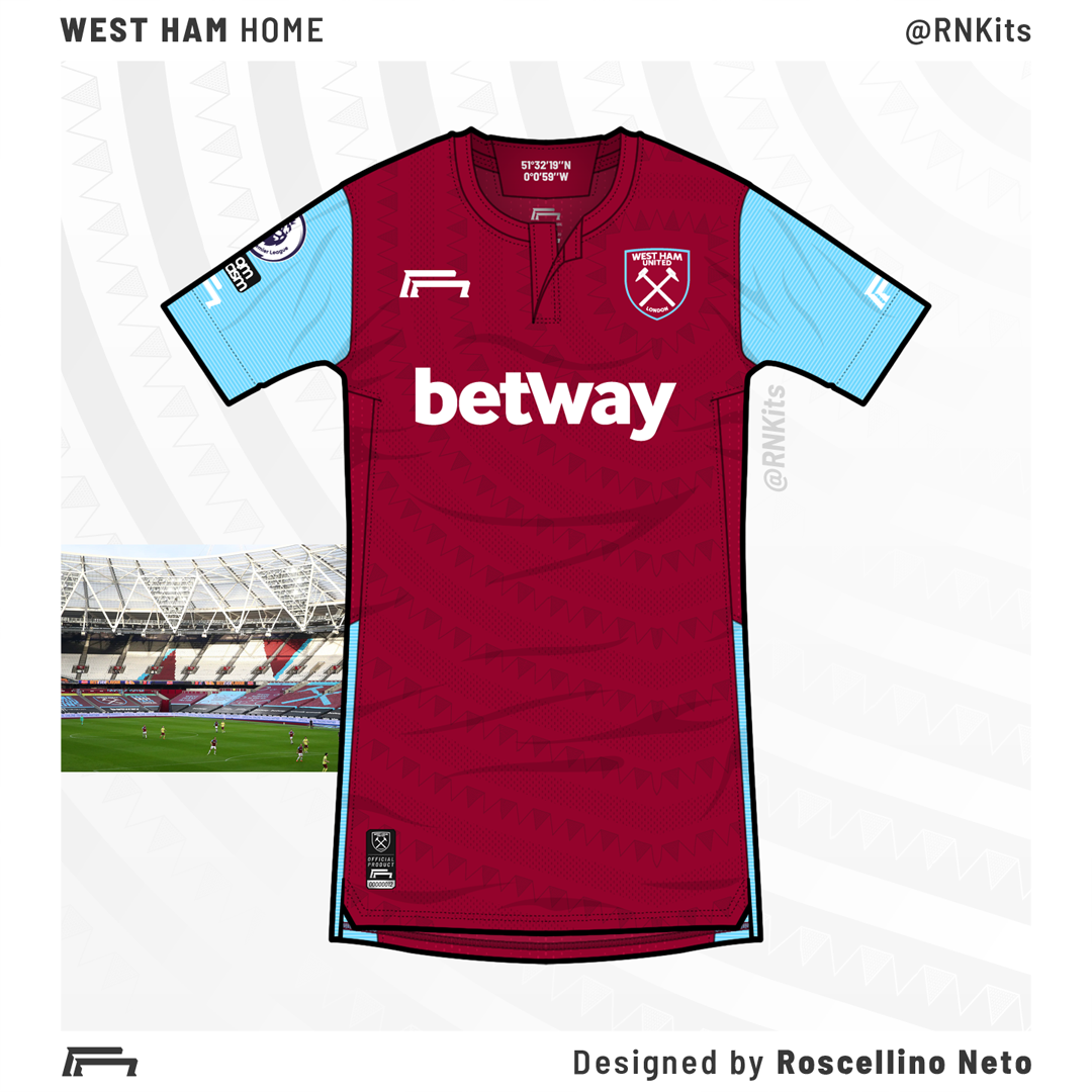 A camisa home do West Ham deveria ser feita com referências ao estádio do clube. Utilizei detalhes do telhado do estádio, que foram as estruturas triangulares e as linhas. A camisa vem no novo template RN.