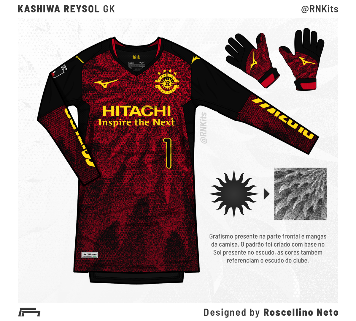 A rodada da JLeague pedia a criação de camisas GK disruptivas. Escolhi o Kashiwa Reysol e fiz um padrão inspirado no Sol, símbolo do clube. A camisa vem toda em preto e tons de vermelho, com o amarelo vibrante nas aplicações.