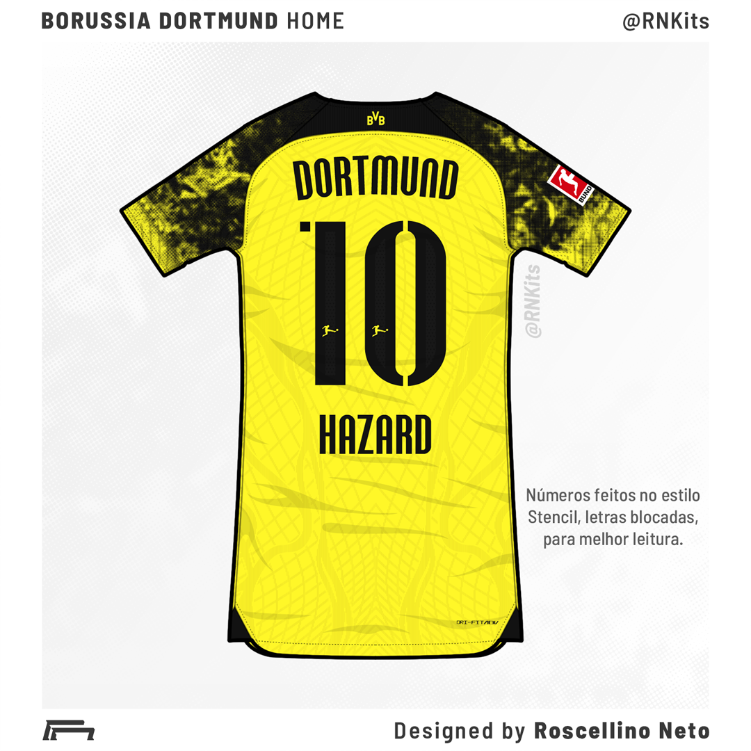 Na rodada 7, deveria ser criada uma fonte exclusiva para a Bundesliga, focando no número 10, nome do jogador e clube. Criei a fonte inspirado no estilo Stencil. A camisa conta com a imagem da torcida do clube nas mangas.